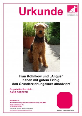 Nachstehende Hundehalter haben ihren Hunden die Übungen des 20 stufigen Trainingsblattes des GrunderziehungsKURSes (genannt Könnenblatt) meiner Hundeschule vermittelt und mir gegenüber nachgewiesen.